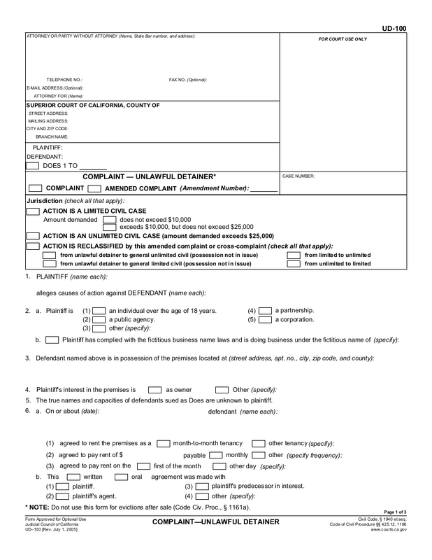 Please note that for the present purposes the most pivotal stage of the eviction process is when a tenant receives a UD. If the tenant does not respond to this in court within five business days of receiving it the landlord may get a default judgement from the court in the tenant’s absence. Whenever possible, tenants should seek legal aid when responding to the UD. Below are blank examples of a Summons and Complaint of Unlawful Detainer.